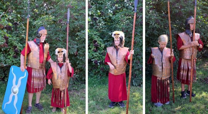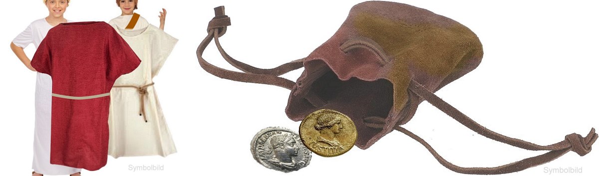 Gerne könnt ihr euch für diesen Nachmittag auch als Römer verkleiden! Wer nichts Passendes hat: Wir haben genügend einfache Römergewänder (Tunikas) in verschiedene Kindergrößen vorbereitet, die könnt ihr direkt am BMX-Patz von uns ausleihen. Es besteht auch die Möglichkeit einen zur Kleidung passenden, kleinen Lederbeutel zu basteln, ihr bekommt sogar noch je zwei römische Repro-Münzen von uns dazu, beides dürft ihr danach mit nach Hause nehmen.