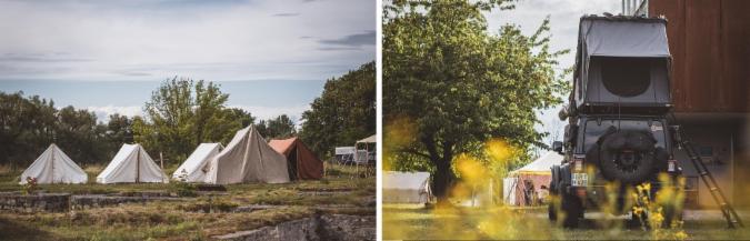 Die Zelte des Römischen Nachtlagers. Während die Soldaten mit ihrer Marschausrüstung auf dem Rücken die 737 km entlang des Limes binnen 5 Wochen ablaufen, kümmert sich eine Crew im Transportfahrzeug (rechts) um das Nachtlager, transportiert die Zelte und baut sie auf.