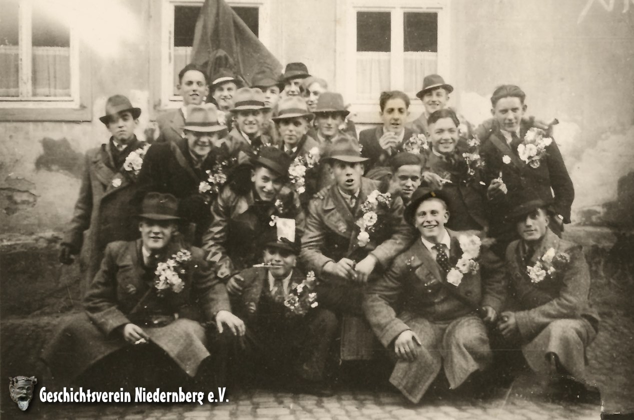 Die Theatergruppe der KJG Niedernberg wurde unter Pfarrer Franz Eckert eingeführt. Die Aufnahme entstand um 1950. Der linke Lanzenträger ist der aus Deutsch-Trebetitsch stammende Willi Ittner.