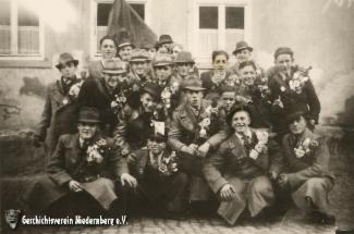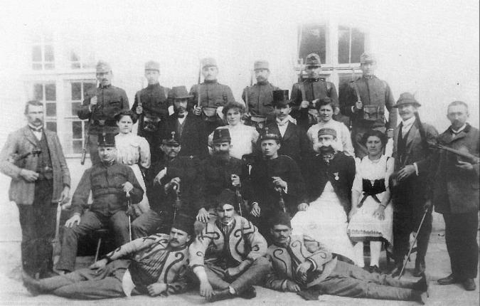 Theatergruppe in Woratschen / Sudetenland vor der Aufführung eines Kriegsstückes. Vorne drei "Bosniaken".