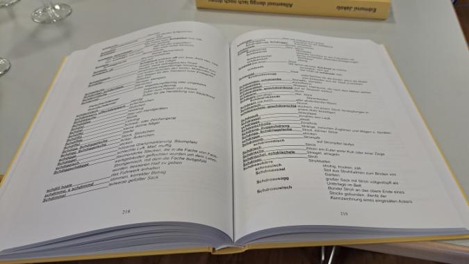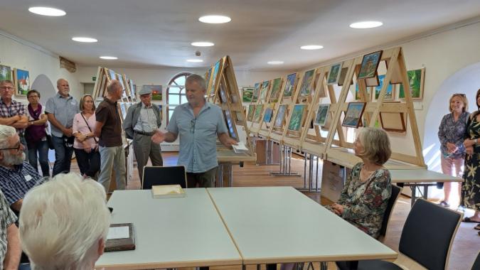 Viele Ausstellungsgäste nahmen die Möglichkeit wahr, das Buch direkt bei der Vernissage zu erwerben. Im Buch sind auch viele Skizzen vom Autor Edmund Jakob aus seinem Leben in einer kleinbäuerlichen Familie zu sehen. Eberhard Lehr (Foto), welcher einige Skizzen für unser Niedernberger Mundartbuch "Sou hon isch gesääd" anfertigte, lobte die überaus gelungenen Zeichnungen seines Kollegen.