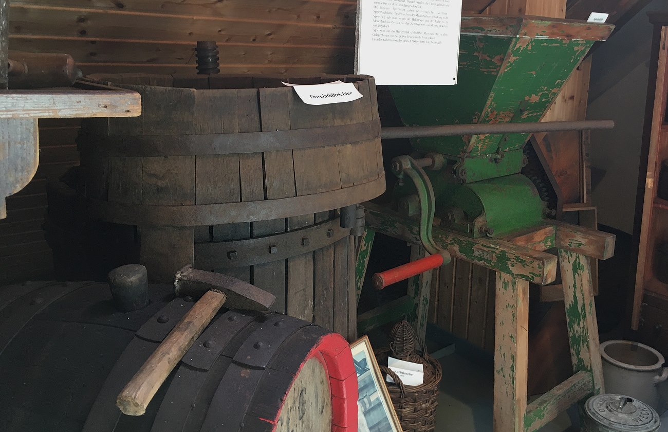 Ausstellungsstücke aus dem Kelterei-Museum während einer temporären Sonderausstellung "Apfelwein" im Medenbacher Heimatmuseum. Danach kommen die Untensilien wieder ins Kelterei-Museum in der Hofreite