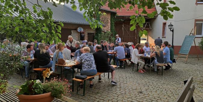 Eine Apfelweinverköstigung, bei welchem das "Stöffche" einiger Keltereien im "Ländchen" (Streuobstkreis Wiebaden / Nassauer Land) auf die Probe gestellt wird, findet einmal jährlich in der Hofreite 21a beim Heimatvereins-Vorsitzenden Dieter Engel statt. Im Bild sehen wir die 17. Apfelweinprobe am 27. Mai 2023, elf Testrunden standen an, bewertet wurde jeweils nach Farbe, Geruch, Geschmack und Gesamteindruck.