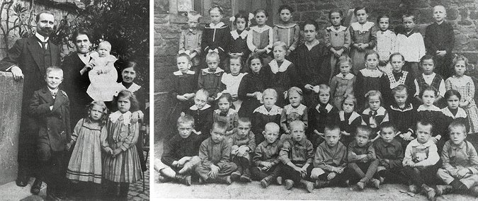 1912: Fotoshooting vor der Sandsteinschule: Lehrer Karl Röther mit Familie. Fräulein Kresel mit Schulklasse