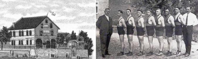 Der Kraft-Sport-Club Germania wurde 1910 im Gasthaus "Zur Linde" als der erste sporttreibende Verein in der damals noch rein landwirtschaftlich geprägten Gemeinde Niedernbergs gegründet. Innerhalb kurzer Zeit wurden Sportgeräte wie Matte, Hantel und Gewichte zum Steinstoßen angeschafft. Da es damals noch keine Sporthalle gab, man aber einen Übungsraum benötigte, wurde als Vereinslokal des KSC Niedernberg das Gasthaus »Zur Mainaussicht« (Bild links) gewählt, das im oberen Stock einen Tanzsaal besaß (ein solcher wurde im Gasthaus ZUR LINDE erst in späteren Jahren aufgestockt.. Unzählige Titel einzelner Sportler und Mannschaftsmeisterschaften sollten folgen, u.a. die Bezirksmeisterschaft 1933/34 (Foto oben rechts)