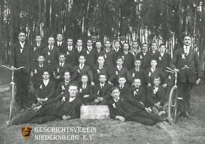 Um das Interesse der Jugend für den Kriegsdienst zu wecken, wurde zu Beginn des ersten Weltkrieges die Niedernberger Jugendwehr ins Leben gerufen. Neben sportlichen Betätigungen fand u.a. das Ausheben von Schützengräben im Tannenwäldchen, wo auch diese Aufnahme 1915 entstand, unter Aufsicht erfahrener Veteranen statt..
