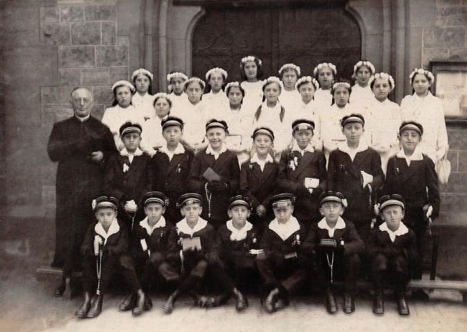 Pfarrer Seubert mit Kommunionkinder vor dem Haupteingang der Cyriakuskirche, um 1910