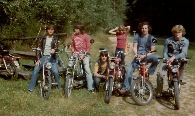 Niedernberger Jungs am Waldparkplatz. Puch, Hercules und Kreidler, das waren wie meistgefahrtenen Mofas in der damaligen Zeit. In jedem Ort gab es "Mofa-Cliquen", man rockte durch die umliegenden "Käffer". Je schneller der fahrbare Untersatz war, desto angesehener war der Driver bei seinen Gleichgesinnten. Zugelassen waren Mofas bis 25 km/h - doch dies war den meisten entschieden zu wenig, und so musste man schon mal In die Trickkiste greifen. "Frisieren" war das Zauberwort - und Niedernberg war eine regelrechte Frisier-Hochburg, bis zu 100 km/h brachten manchen Kisten nach Bearbeitung von Krümmer, Kolben und Ein-/Auslassventile auf die Straße. Polizeikontrollen waren somit an der Tagesordnung. Die stolzen Fahrer v.li.n.re.: Uwe Aust, Hermann Fischer , Klaus-Peter Becker, Arnold Schreck, Horst Hohm.