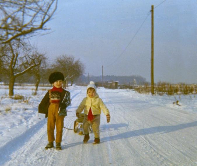 Lang, lang ist's her. Zwei Niedernberger Buben auf dem Rückweg vom "Schlittenhügel" am alten Tannenwäldchen-Sportplatz. Im Hintergrund das Kassehäuschen und die Zaunpfleiler der ehemaligen "Müllkaute". Auch die hölzernen Strommasten sind mittlerweile "Schnee von gestern".