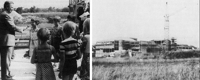 Rektor Dechent und Astrid Wagner bei der Grundsteinlegung der Grundschule am 25.7.1978. Baustelle mit Rohbau