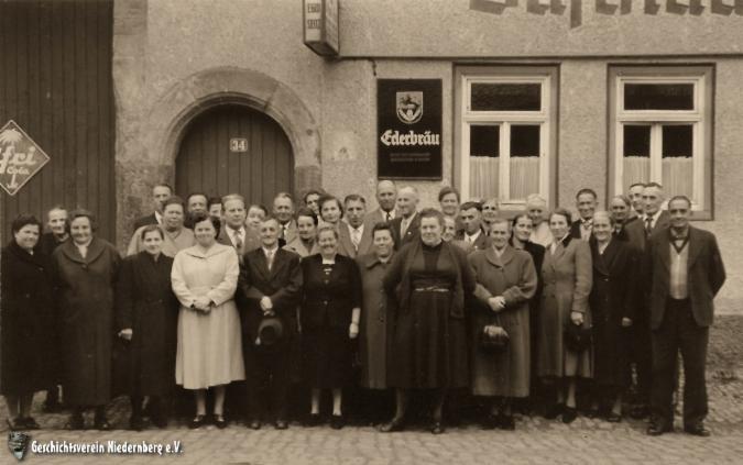 Auf unserem heutigen Highlight-Foto sehen wir den Jahrgang 1907/08 beim Klassentreffen im Jahre 1957. Das Gruppenfoto wurde vor dem Gasthaus „Zur Krone“ aufgenommen, in dem man sich zur geselligen Runde traf. An der Hauswand hängt ein Emailleschild der Brauerei Eder, ein damals typisches Afri Cola – Blechschild ziert das Hoftor. Seitlich am Gaststättenschild kann man den Wirtsnamen Egid Seitz lesen. „Äschid“ hatte den Wirtschaftsbetieb 1948 in dritter Generation zusammen mit seiner Frau Anna übernommen, bot zudem Fremdenzimmer mit fließend Wasser und Zentralheizung an. Der „Ebblwoi“ kam aus der eigenen Apfelweinkelterei, dazu passend war der von Anna zubereitete „Handkäse mit Musik“ bei den Gästen sehr beliebt. Auch der Teig für’s Brot wurde noch selbst hergestellt, einen Steinwurf entfernt ließ man das Brot dann beim „Schmittsbäcker“ backen.
