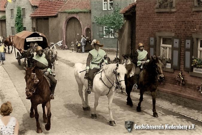 Das nachfolgende Highlight-Foto entstand im Jahre 1959. Wir sehen eine Szene des Heimat- und Wasserfest-Umzuges, der anlässlich der Einsegnung des Wasserturmes stattfand. Der Schwedenkönig Gustav Adolf zieht im Dreißigjährigen Krieg auf einem Schimmel vor seinem Tross-Gespann (Versorgungswagen) durch die 1959 noch gepflasterte Hauptstraße, kurz vor dem Übergang „Ewwerdorf zum Neidorf“ (ab Dorfplatz), wo auch früher das obere Torhaus der Dorfschutzmauer stand. Im Hintergrund das ehemalige Wohnhaus der Familie Longin Fecher samt denkmalgeschütztem Hoftor mit Sandsteinbögen von 1720. Vor der Pforte stehen u.a. Monika und Toni, verdeckt hinter Oma Marie ihre Eltern Longin und Gretchen.