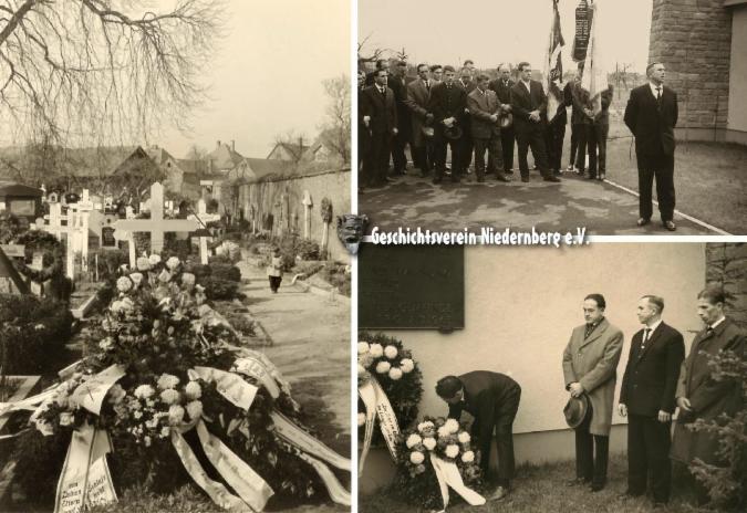 Die abgebildeten Fotos zeigen ein im Jahre 1957 mit Blumen und Kränzen geschmücktes Grab auf dem alten Friedhof sowie eine Kranzniederlegung 1963 am neu eingesegneten Friedhof zum Gedenken an die gefallenen Soldaten u. Opfer der beiden Weltkriege. Der November gilt als der Monat des Gedenkens. Den Anfang machen Allerheiligen und Allerseelen am 1. und 2. November. Seit 1952 wird der Volkstrauertag zwei Wochen vor dem 1. Adventssonntag begangen, in diesem Jahr findet er am kommenden Sonntag, den 13.11. statt. Der Buss- und Bettag wurde auf den Mittwoch vor dem Totensonntag (dem Sonntag vor dem 1. Advent) gelegt, im Jahre 2022 der 16. und 20. November.