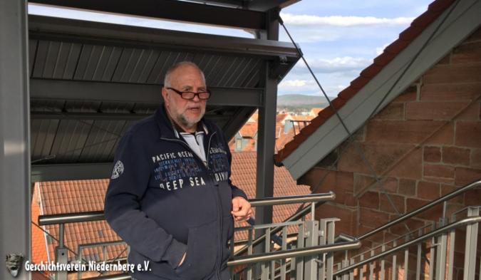 Willi Mayer über den Dächern von Niedernberg! Das Foto entstand am 18. März 2023, beim ersten Treffen im Sammelsurium (Dachgeschoss Sandsteinschule) anlässlich einiger Probescans von alten Dias. Willi wohnt seit 2007 im "Honischland", aufgewachsen