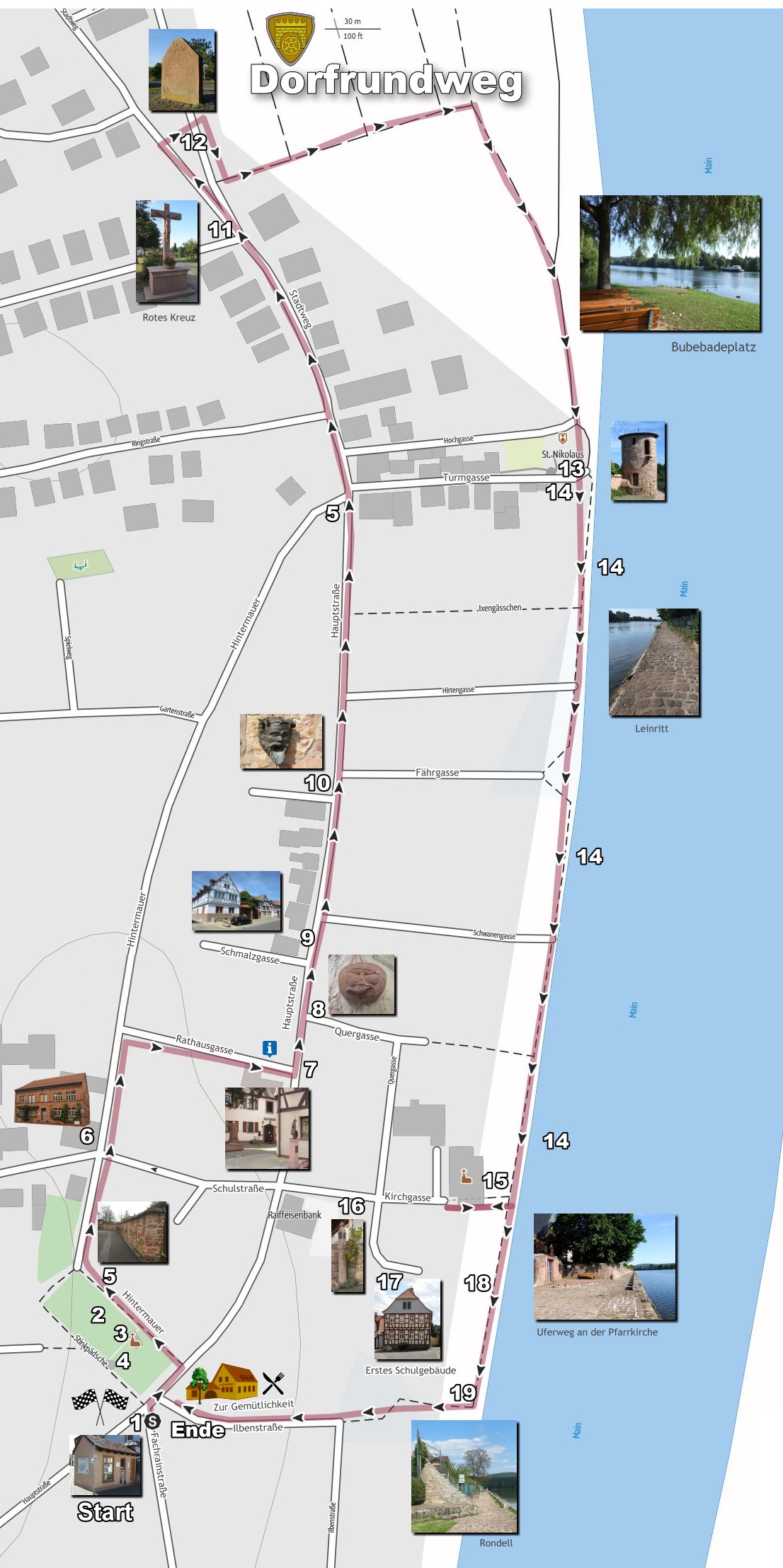 Der Weg führt über den Dorfplatz und der Ruhestätte des alten Friedhofes, danach entlang der alten Dorfmauer zur Sandsteinschule, kurz danach in der Hintermauer rechts ab in die Rathausgasse bis vor zum Rathaus. Jetzt die Hauptstraße entlang bis zum Stückerweg, dann wieder retour und die Turmgasse hinunter zum Mainufer oder die Alternativroute nordöstlich über den Bubebadeplastz bis uzum Turm. Von hier aus dem Leinritt entlang bis zur Kirche mit Besichtigung der ersten Schule in der Kirchgasse und dem Bildstock aus dem 15. Jahrhundert. Wieder retour zum Mainufer, rechts im Garten befand sich die römische Badeanlage. Nun entlang des Ufers bis zum Rondell, direkt danach wieder hoch ins Ort zum Ausgangspunkt Wiegehäuschen. Zum Abschluß der Runde besteht die Möglichkeit zu einer Einkehr im historischen Gasthaus "Zur Gemütlichkeit" (seit 1876, direkt am Wiegehäuschen) oder in einer der weiteren, umliegenden Niedernberger Gaststätten.
