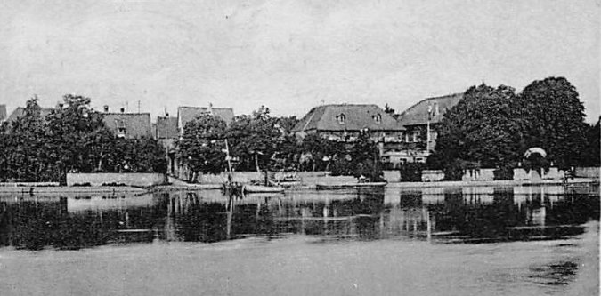 Das Gasthaus „Zur Mainaussicht“ mit dem schönen Biergarten am Main; 1898 wurde erweitert, im Jahr 2016 abgerissen.