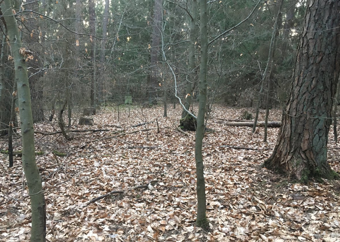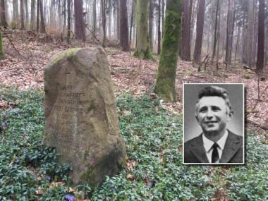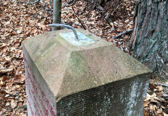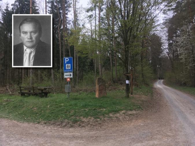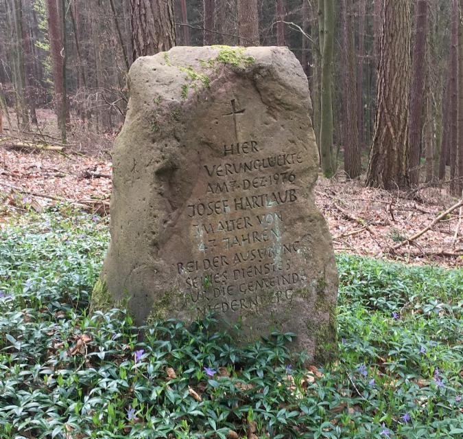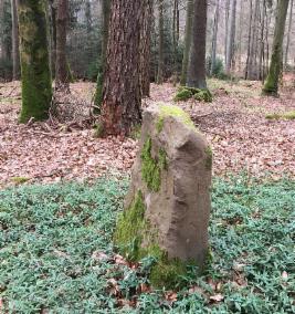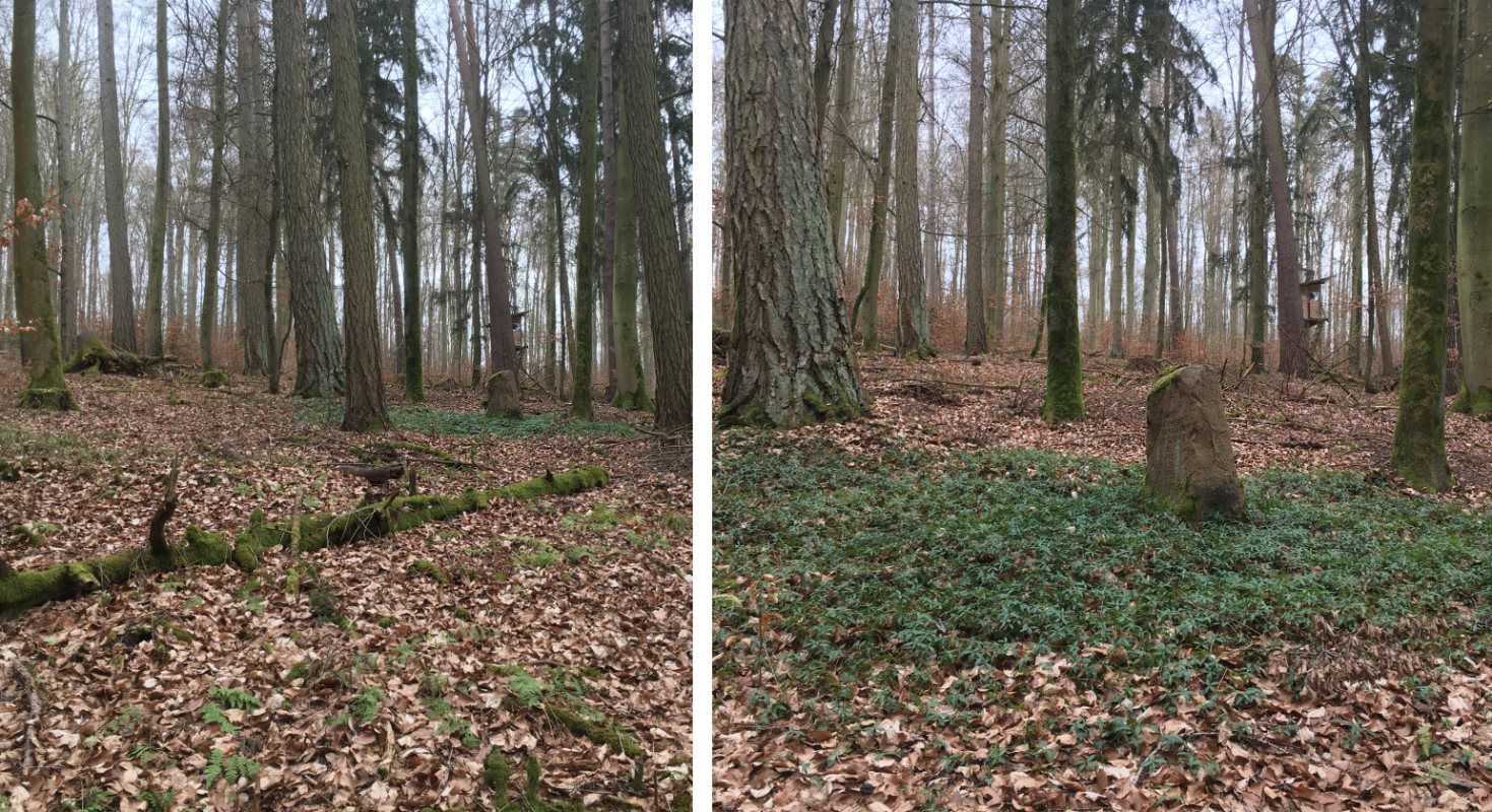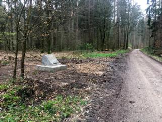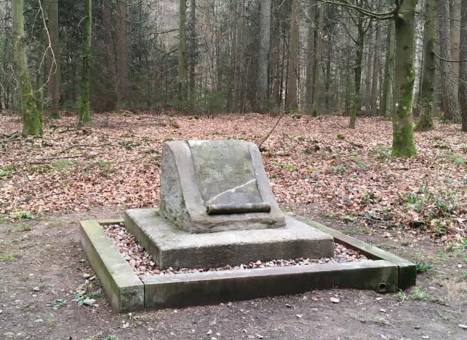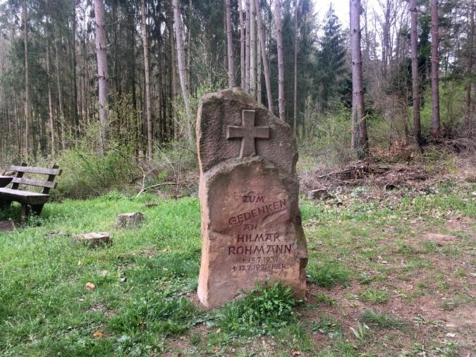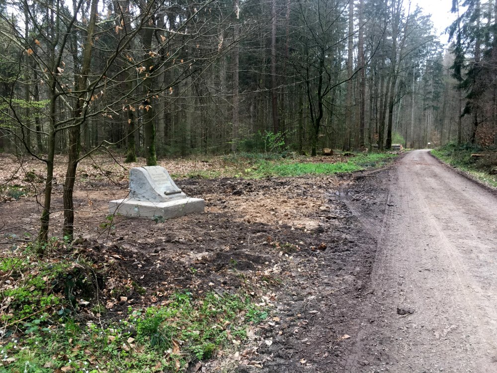Fotos 24. März 2021: Ab Mai ist der Gedenkstein, der ziemlich unzugänglich abseits des Weges ruht, anhand des Blattwerkes der Jungbäume nur noch schwer zu finden und zu erreichen. Der älteste unter den Gedelksteinen ist seit Jahrzehnten seinem Zustand der Natur überlassen.