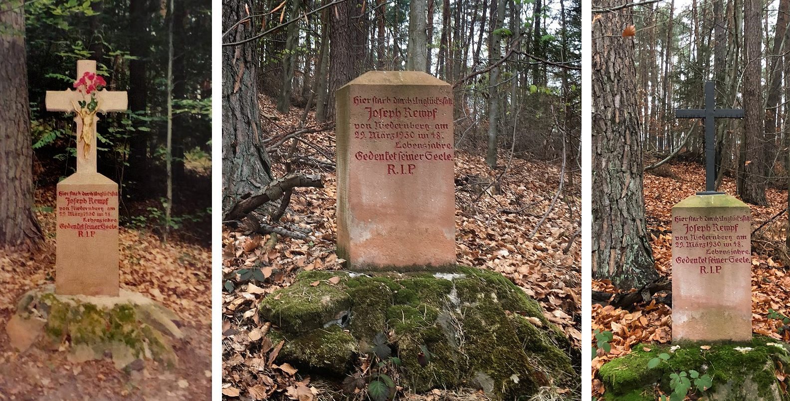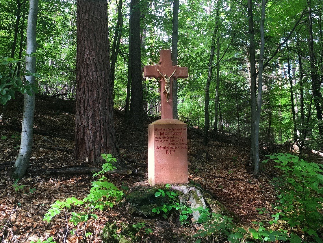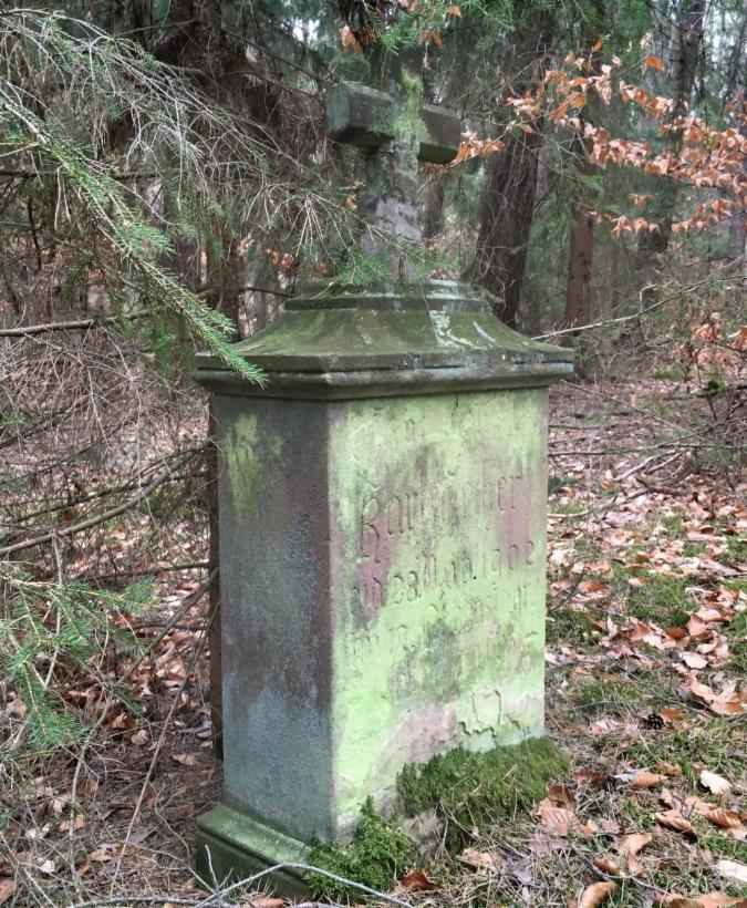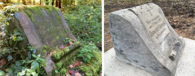Nach aufwendiger Sanierung durch die Nachkommen ähnelt der Gedenkstein mit dem neuen Sandsteinkreuz seit April 2021 wieder seiner ursprünglicher Form.