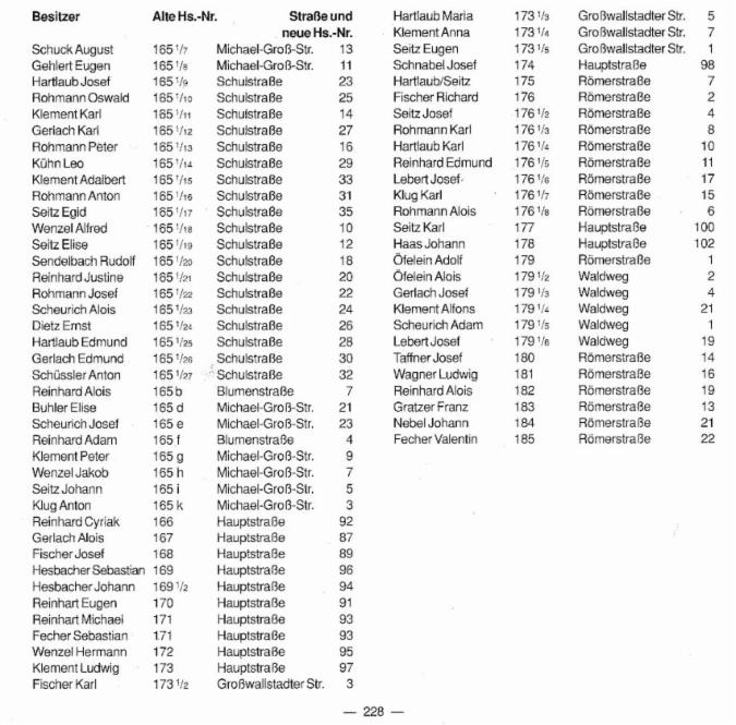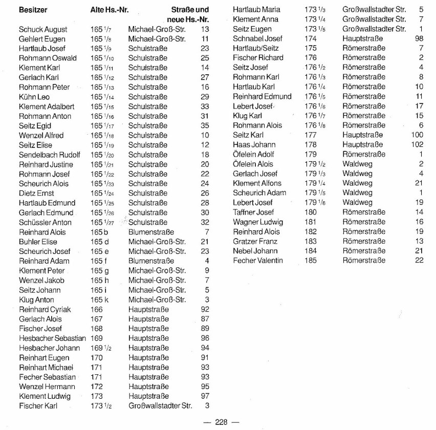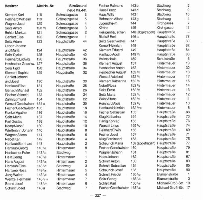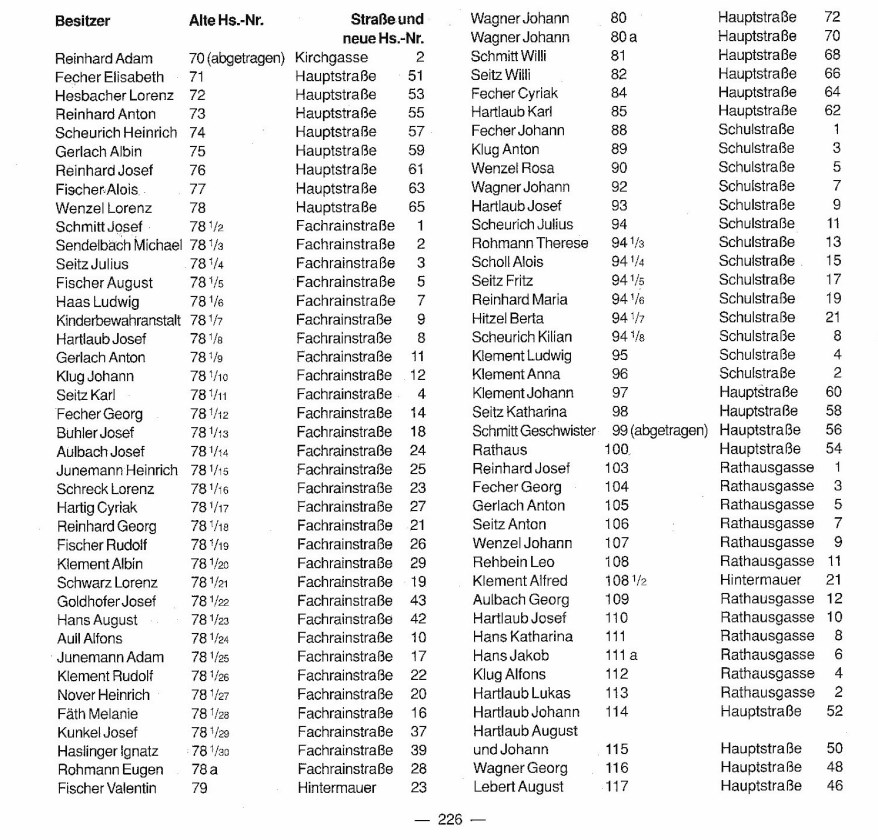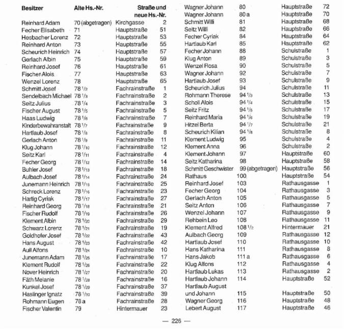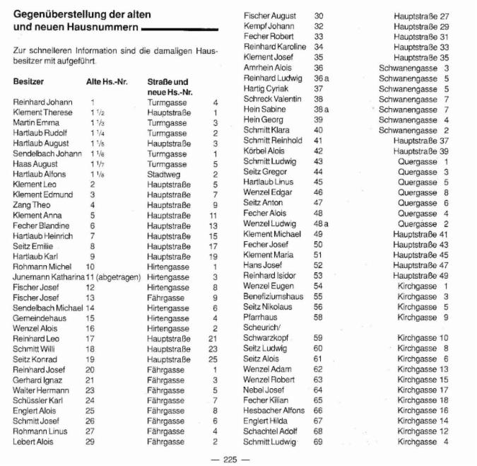 Gegenüberstellung der alten und neuen Hausnummern (Heimatbuch):