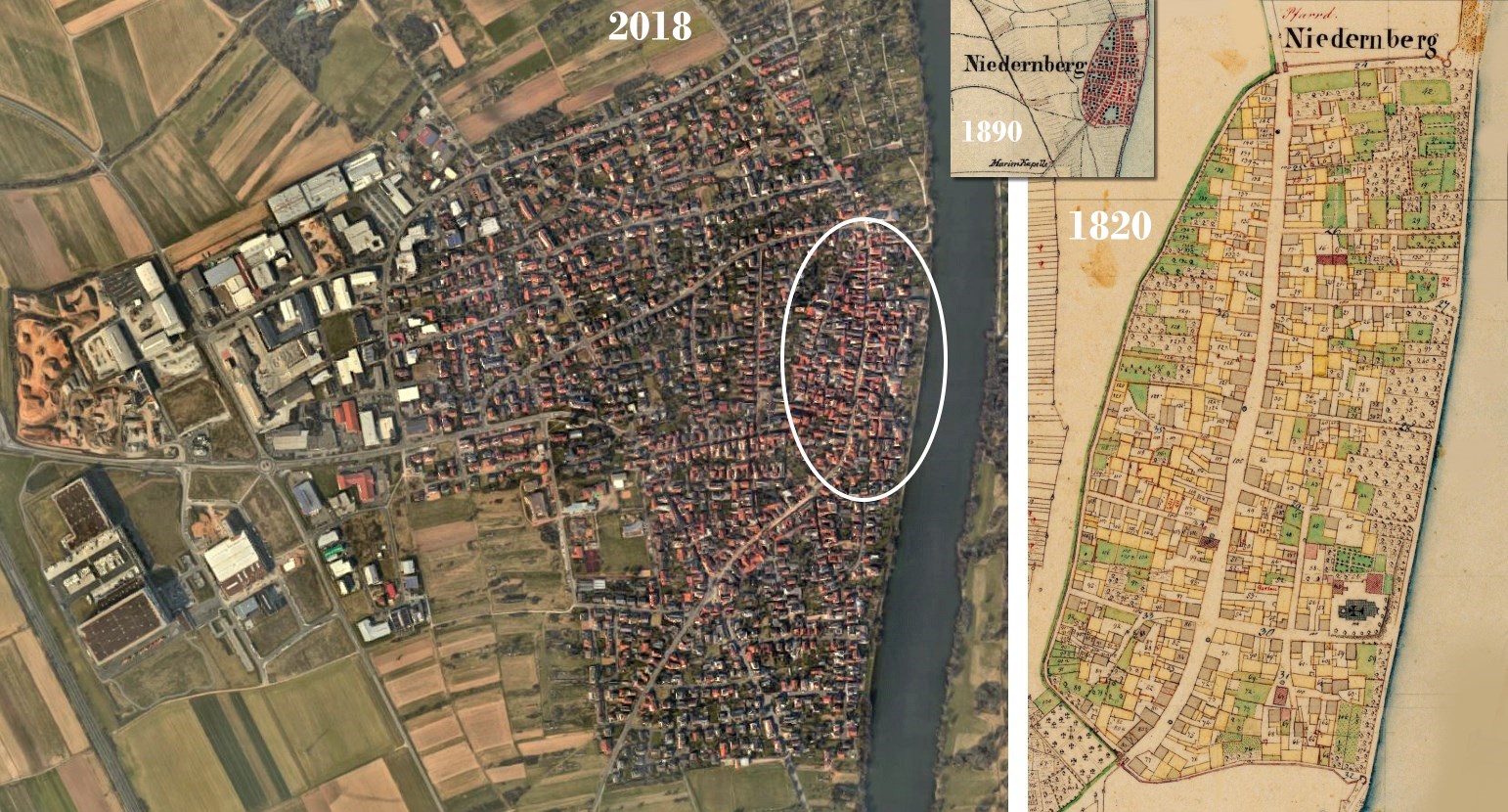 Vergleichsbilder 2018 mit 1890 und 1820 (ca.- Angaben). 1870 entstanden die ersten Häuser außerhalb der Ortsmauer
