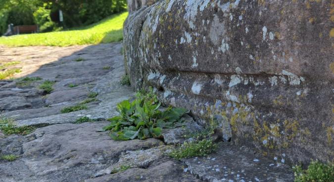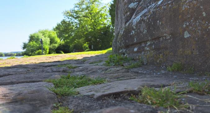 Die weichen Sandsteine des Rondells zeigen Schleifspuren, welche von den langen Zugleinen der Leinreiter stammen, die hier an der Engstelle vorbei mussten. Der Leinritt war vor der