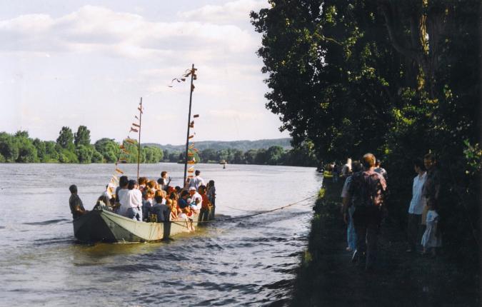 Mit dem Fährkahn auf Spuren der Leinreiter (Bild oben Ferienspiele 1988, unten Historisches Dorffest 1995)
