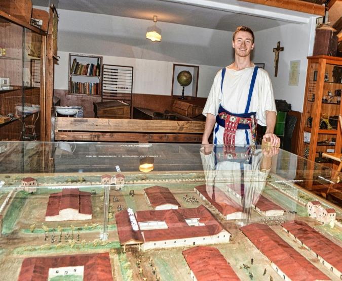 Tommes im Sammelsurium bei Besichtigung des Römerkastell-Nachbaues.