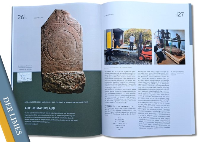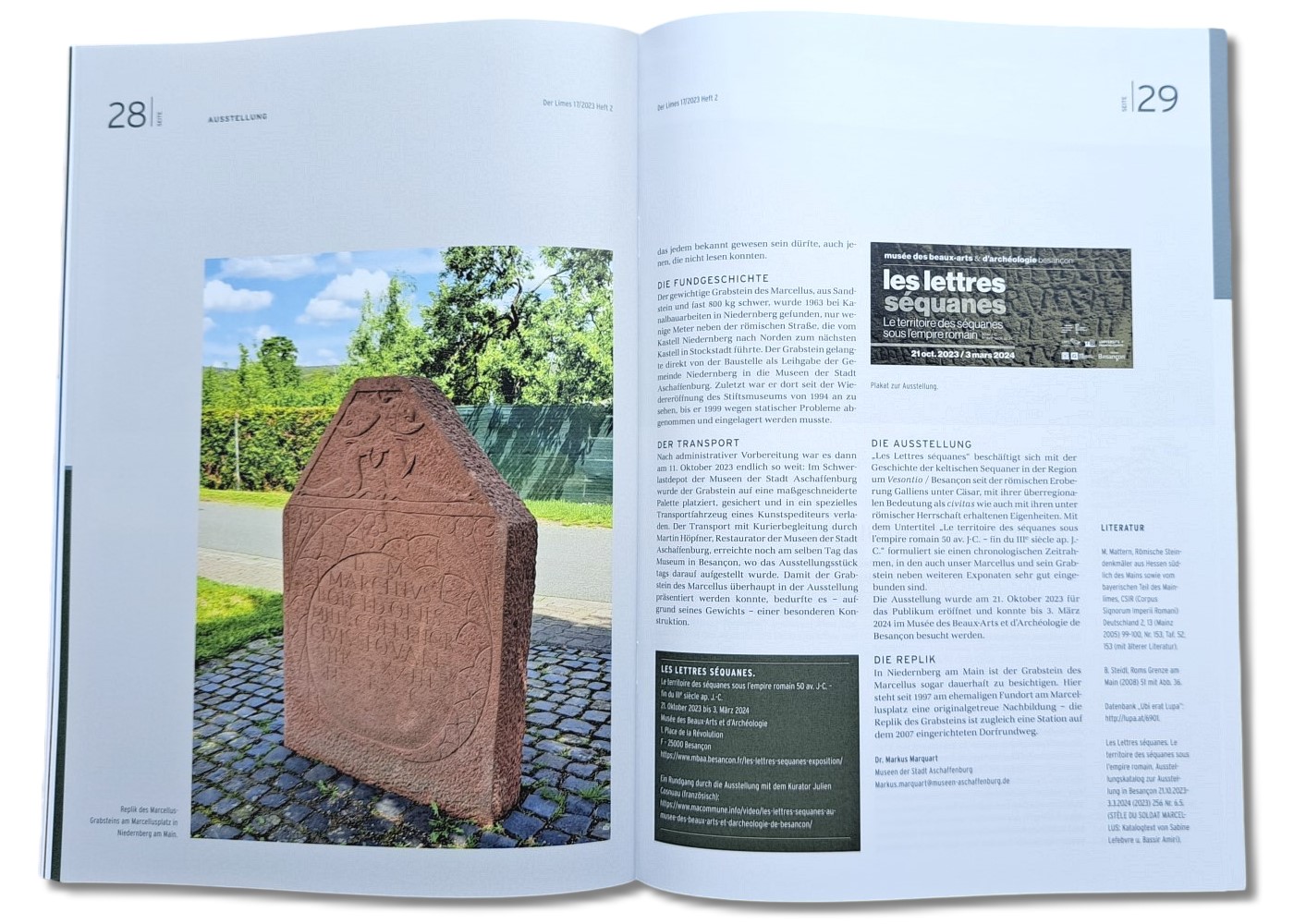 Von Oktober 2023 bis März 2024 befand sich das Original auf einer Ausstellung über die keltischen Sequaner in Besançon. Der 800 kg schwere Stein wurde mit einem speziellen Transsportfahrzeug eines Kunstspediteurs, organisiert von den Museen der Stadt Aschaffenburg, nach Frankreich auf "Heimaturlaub" gebracht. Die interessante Geschichte, welche hinter dieser Ausstellung und dem Grabstein steht, kann man hier... in der Onlineversion auf den Seiten 26 bis 29 nachlesen.