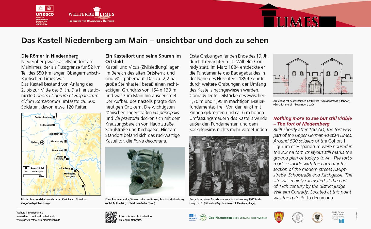 Niedernberg était un fort romain au bord du Limes sur le Main qui, en tant que frontière fluviale de 52 km, faisait partie du Limes de Germanie supérieure et de Rhétie sur une longueur totale de 550 km. Ce fort romain a existé du début du 2e jusqu’au milieu du 3e siècle. La Cohors I Ligurum et Hispanorum civium Romanorum était stationnée ici et comprenait environ 500 soldats dont environ 120 cavaliers.