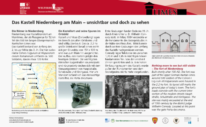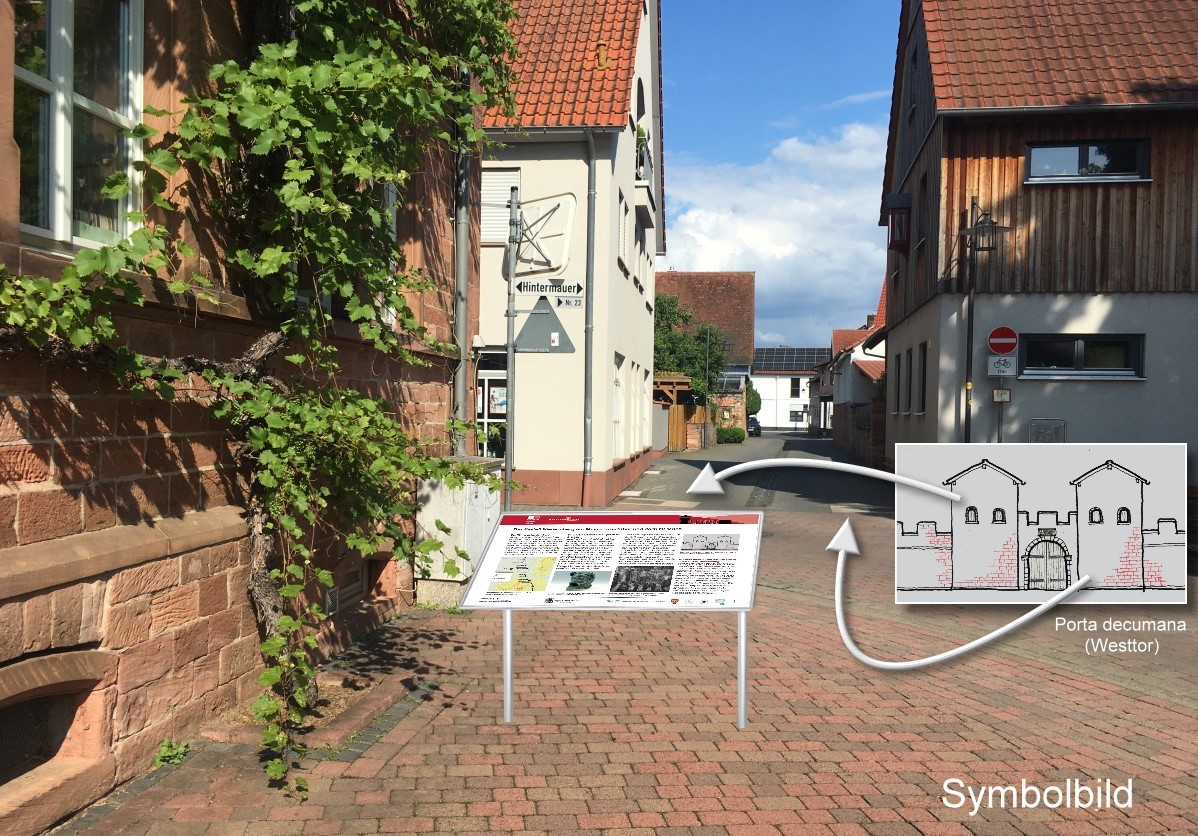 Direkt vor der Sandsteinschule wird eine Informationstafel über die römische Vergangenheit von Niedernberg errichtet. Diese wird in Form einer abgeschrägten Pulttafel mit einem Rollstuhl unterfahrbar sein, der Blick beim Lesen richtet sich zum ehemaligen westlichen Kastelltor "Porta decumana", siehe auch Symbolfoto.