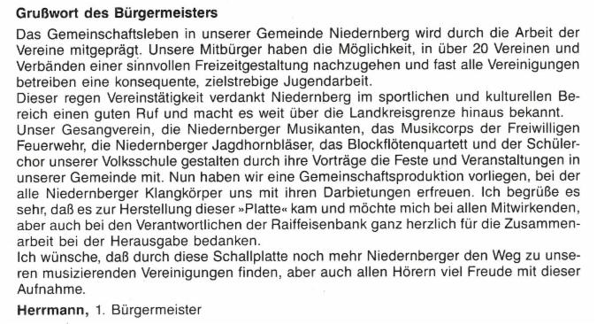 Mitwirkende Musikgruppen: Musikcorps, Jugendchor des Gesangvereins, Flötengruppe und Blockflötenquartett, Niedernberger Jagdhornbläser, Gesangverein Einigkeit 1924 Niedernberg und die Niedernberger Musikanten.