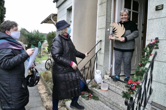Auch an den Vorweihnachtstagen 2020 besuchten die Leiterinnen Lyn und Birgit die Damen des Strickkreises, ehrenamtliche Mitarbeiter und die Senioren, überbrachten Geschenke. Siehe Main-Echo Bericht vom 22.12.2020.