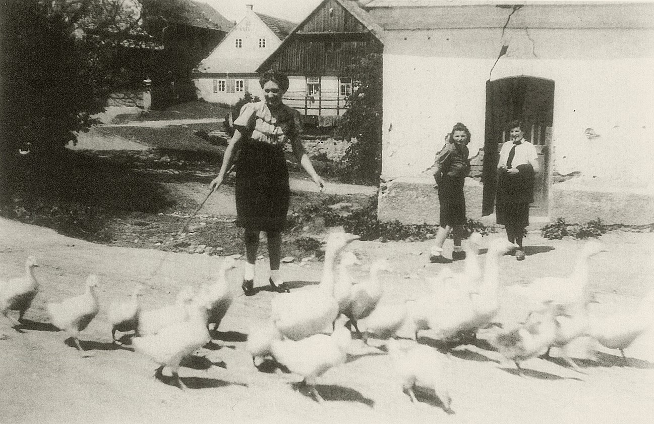 Die Gänseliesl mit ihrem Federvieh auf einer Dorfstraße im Jahre 1942
