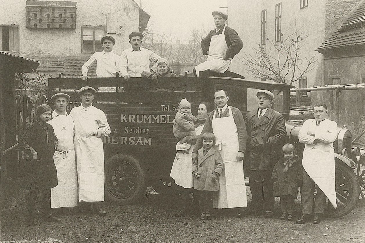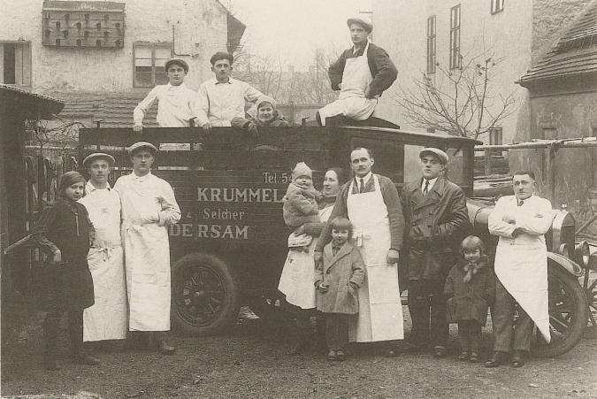 Fleischerei mit Lieferwagen in Podersam 1930