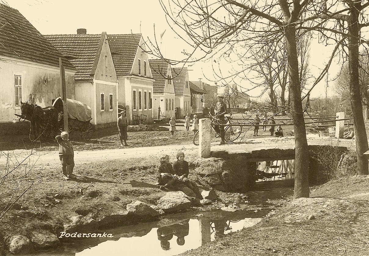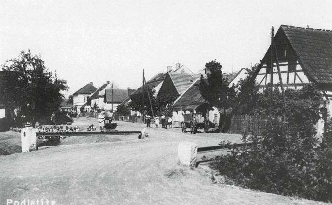 Unteres Dorf von Podletitz. Eine der Brückenn über den Graben, in der linken Bildmitte spielen Kinder am Wasser.