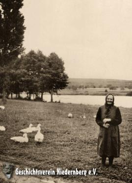 untersagt.“ (Amtsblatt 18/1961). Bild rechts: Magdalena Vettermann (stammt auf Zürnau / Sudetenland) im Jahre 1953 beim Hüten ihrer Gänse am Main.