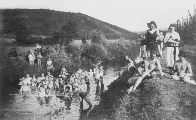 Jugendliche baden in einer Mulde im Goldbach (bei Kriegern).