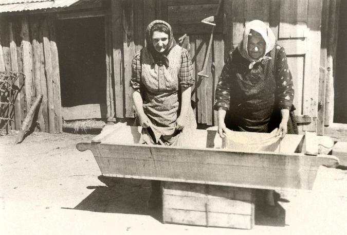 Waschfrauen in Podersanka. Die "Kobbdichlá" (Kopftücher) schützen sie vor der Sonne.