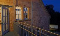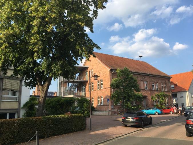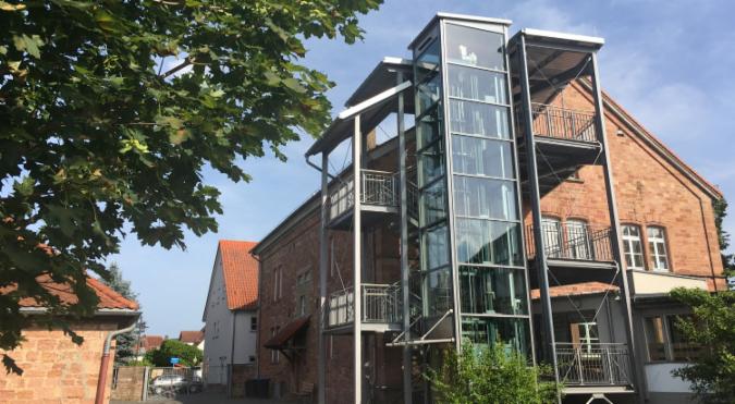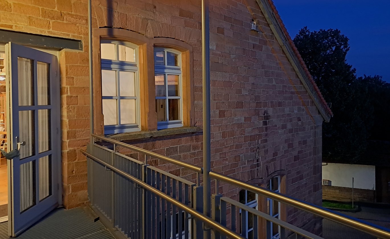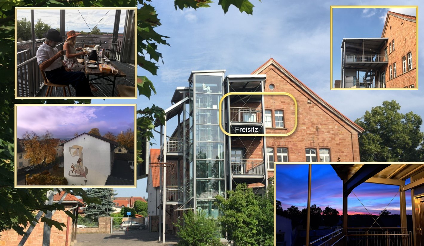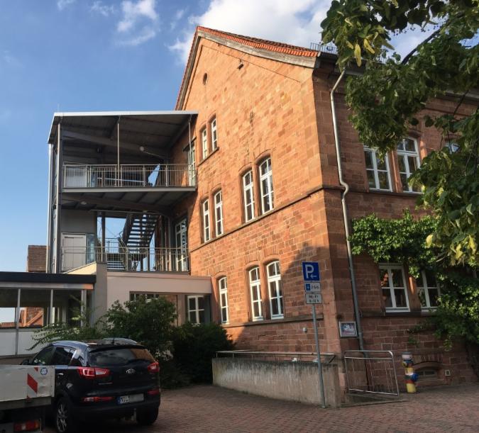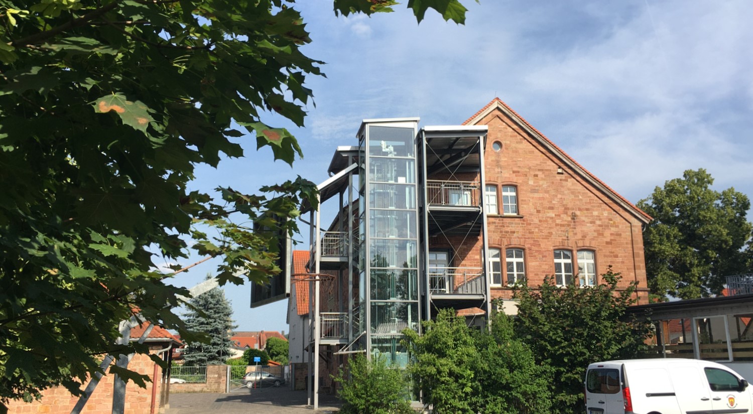 Eingang durch den Hof der Sandsteinschule über die Aussentreppe / Fahrstuhl.