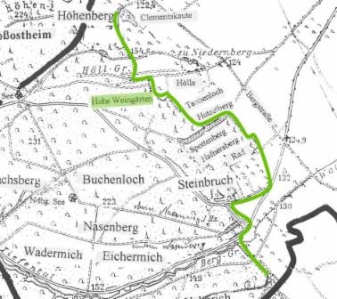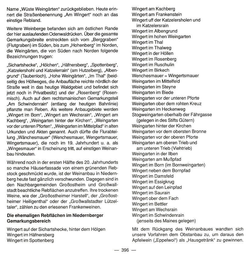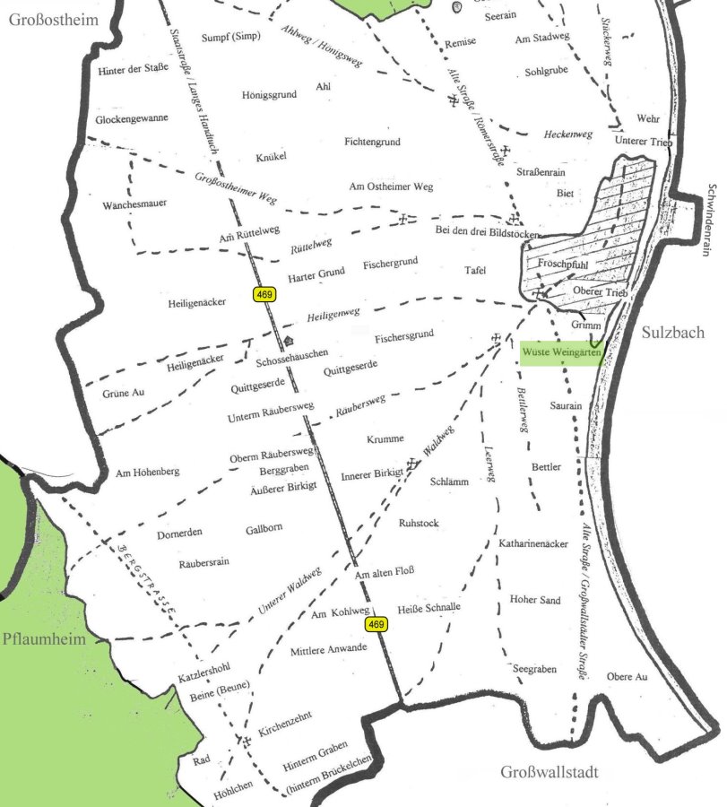 sich entlang der heutigen Großwallstädter Straße. Die Flurname, "Hohe Weingärten" und "Wüste Weingärten" und der heutige Straßenname „Am Wingert“