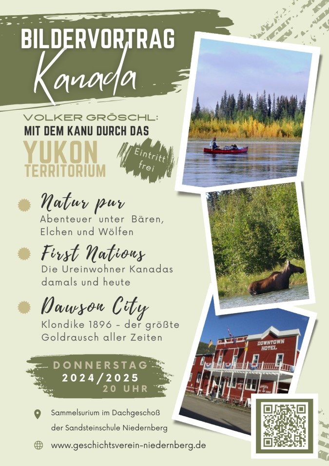 Volker Gröschl führt uns in seiner Bilderreise auf eine abenteuerliche Kanutour durch das überwiegend unbewohnte Yukon Territorium in Kanada und in die ehemalige Goldgräberstadt Dawson City. Sie wurde 1896 zu Beginn des legendären Klondike-Goldrausches - dem größten aller Zeiten - gegründet. Im Yukon Territorium, das mit 482.000 km² etwa so groß wie Deutschland, Österreich und die Schweiz zusammen ist, leben nur insgesamt 43.000 Menschen, zweit Drittel davon in der Hauptstadt Whitehorse. Während in Deutschland durchschnittlich 236 Menschen pro km² leben, liegt die Bevölkerungsdichte im Territorium bei nur unglaublichen 0,08 je km². Das bedeutet, dass - rein rechnerisch - auf einer Landfläche, so groß wie die komplette Gemarkung Niedernberg, anstatt 5000 Einwohner nur ein einziger Mensch leben würde. In den ersten 8 Tagen auf dem Pelly River begegnete die 9-köpfige Kanucrew nicht einem einzigen Menschen! Auch kein Fahrzeug oder Boot wurde gesehen oder gehört. Nur das einmal die Woche die Hauptstadt Whitehorse anfliegende Passagierflugzeug sah man weit oben, lautlos am Himmel.